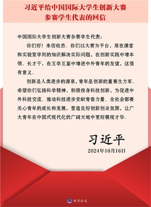 近日,中共中央总书记、国家主席、中央军委主席习近平给中国国际大学生创新大赛参赛学生代表回信,对他们予以亲切勉励并提出殷切希望。[详情]