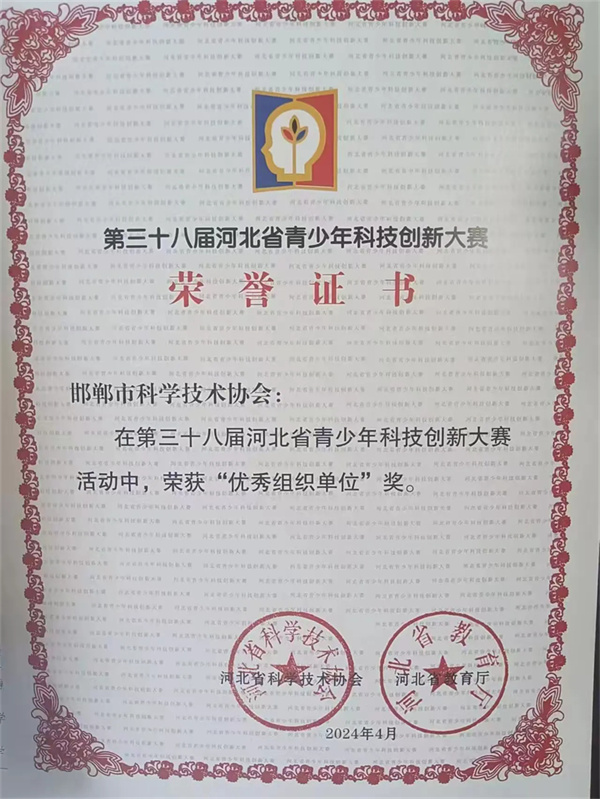 近日,由省科协、省教育厅联合主办的第38届河北省青少年科技创新大赛获奖名单公布。邯郸市科协荣获第38届河北省青少年科技创新大赛“优秀组织单位”称号。