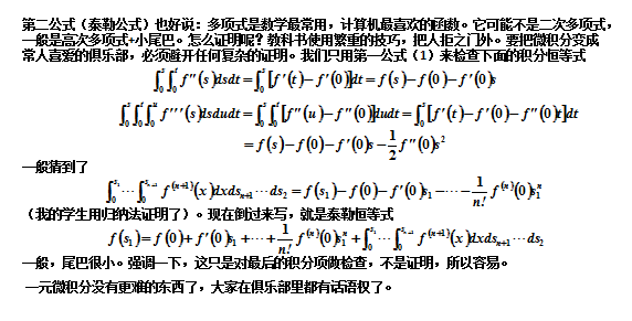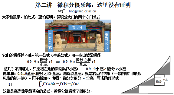 林院士教你不用证明,即可认识和了解微积分的两大公式。首先,由一张山坡图着手,将微分与小高之比推论至微分和与高之比,从而得出微分的积分即为全高,转化为函数形式,认识牛顿-莱布尼兹公式。紧接着用牛莱公式来检查两阶导数的二次积分,三阶导数的三次积分这两个积分恒等式,根据此规律,可以获得n阶导数的n次积分的恒等式,从而得到泰勒公式。