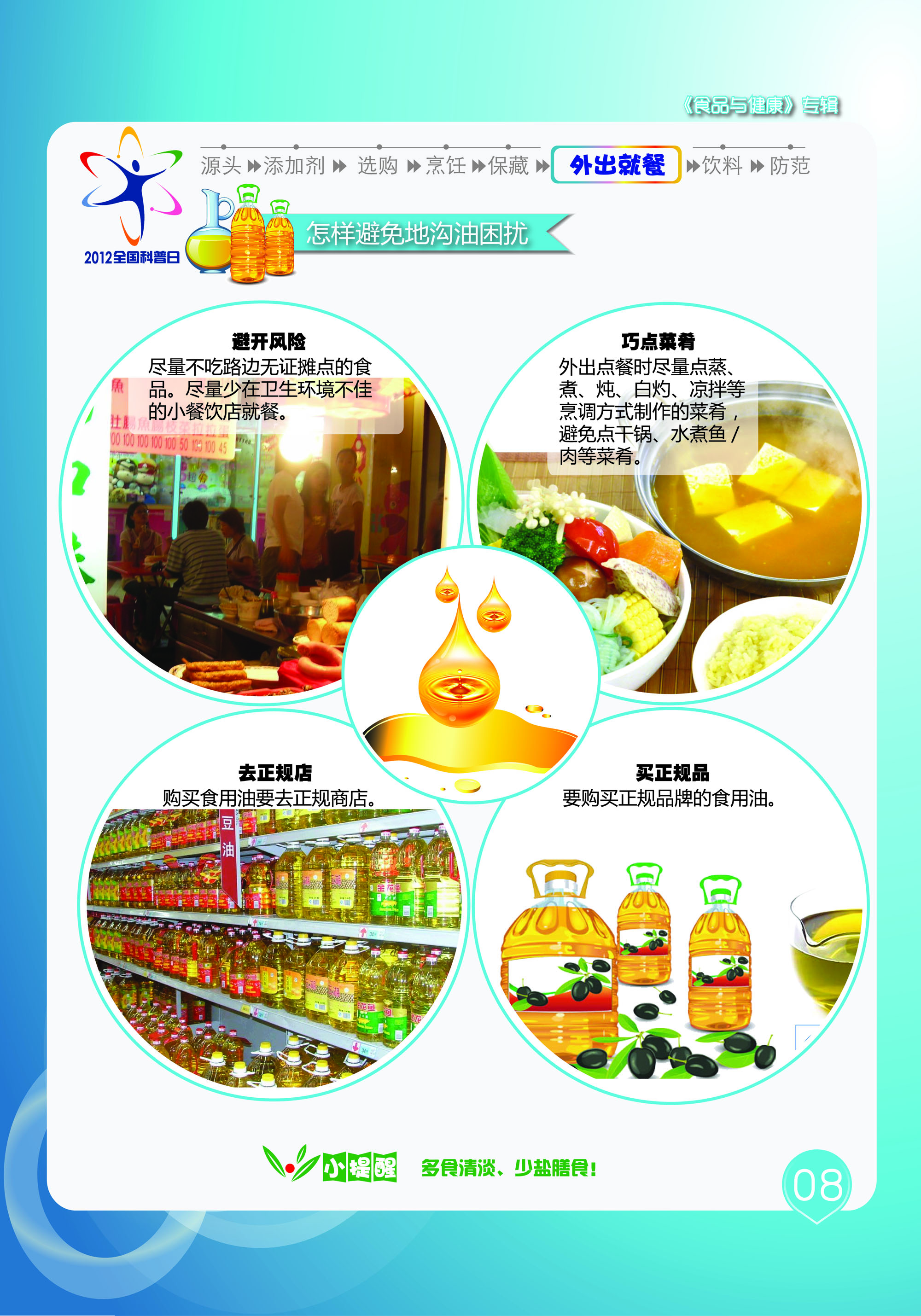 食品与健康主题挂图是2012年全国科普日活动的系列主题挂图之一。共有10张,本资源为第八张,主要内容为怎样避免地沟油的困扰。