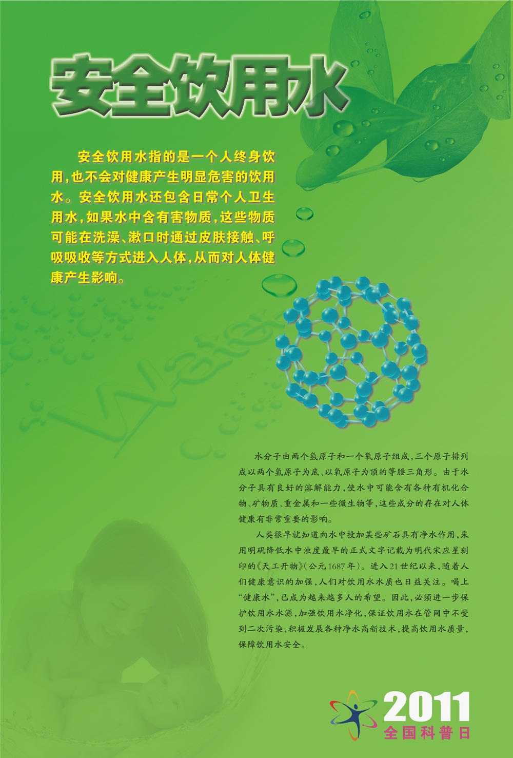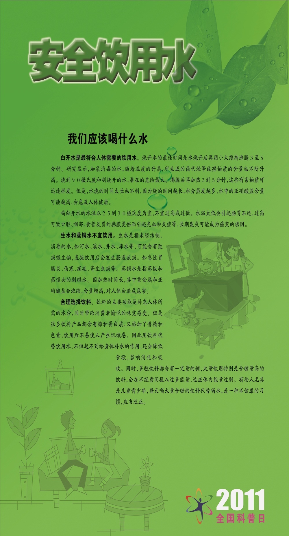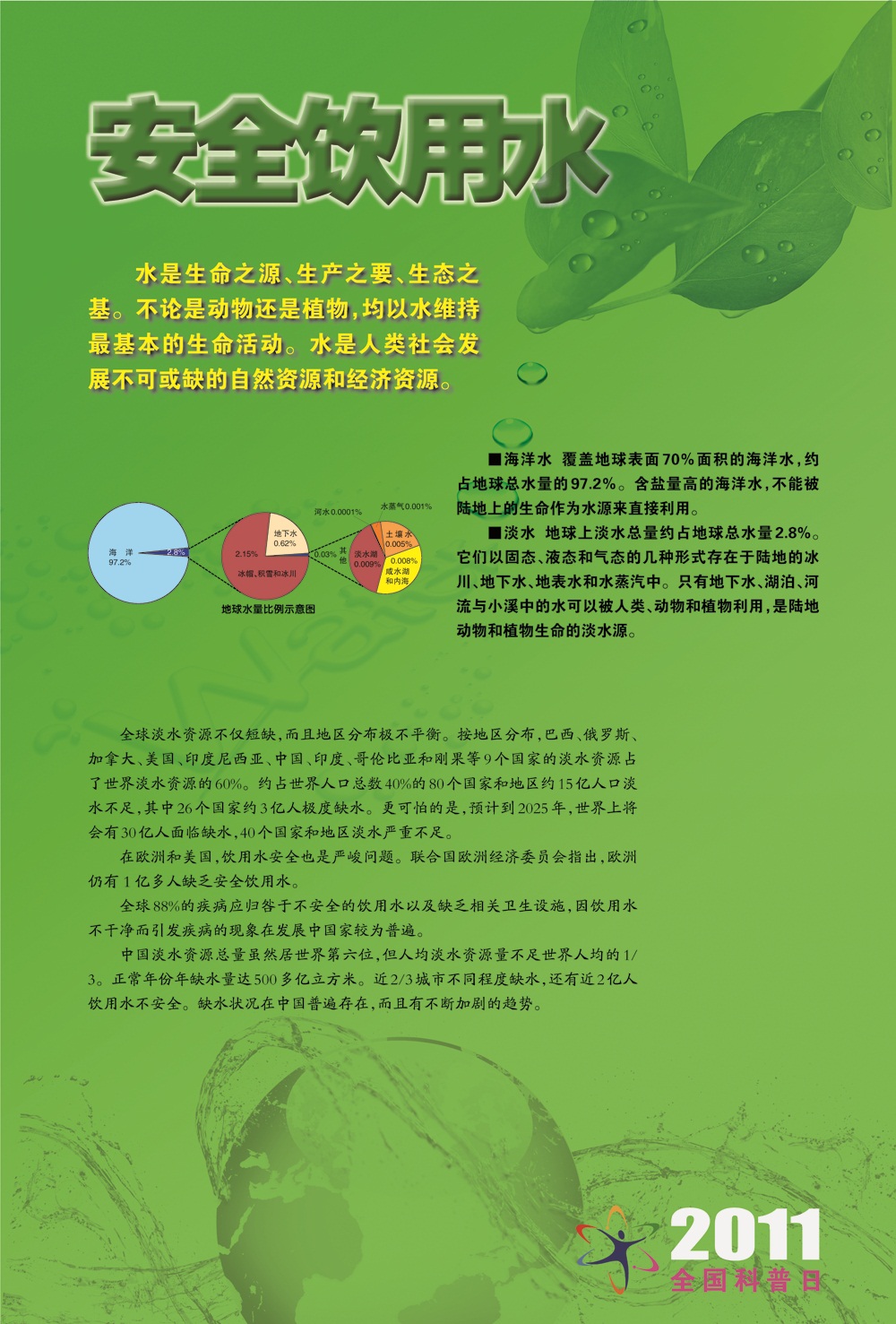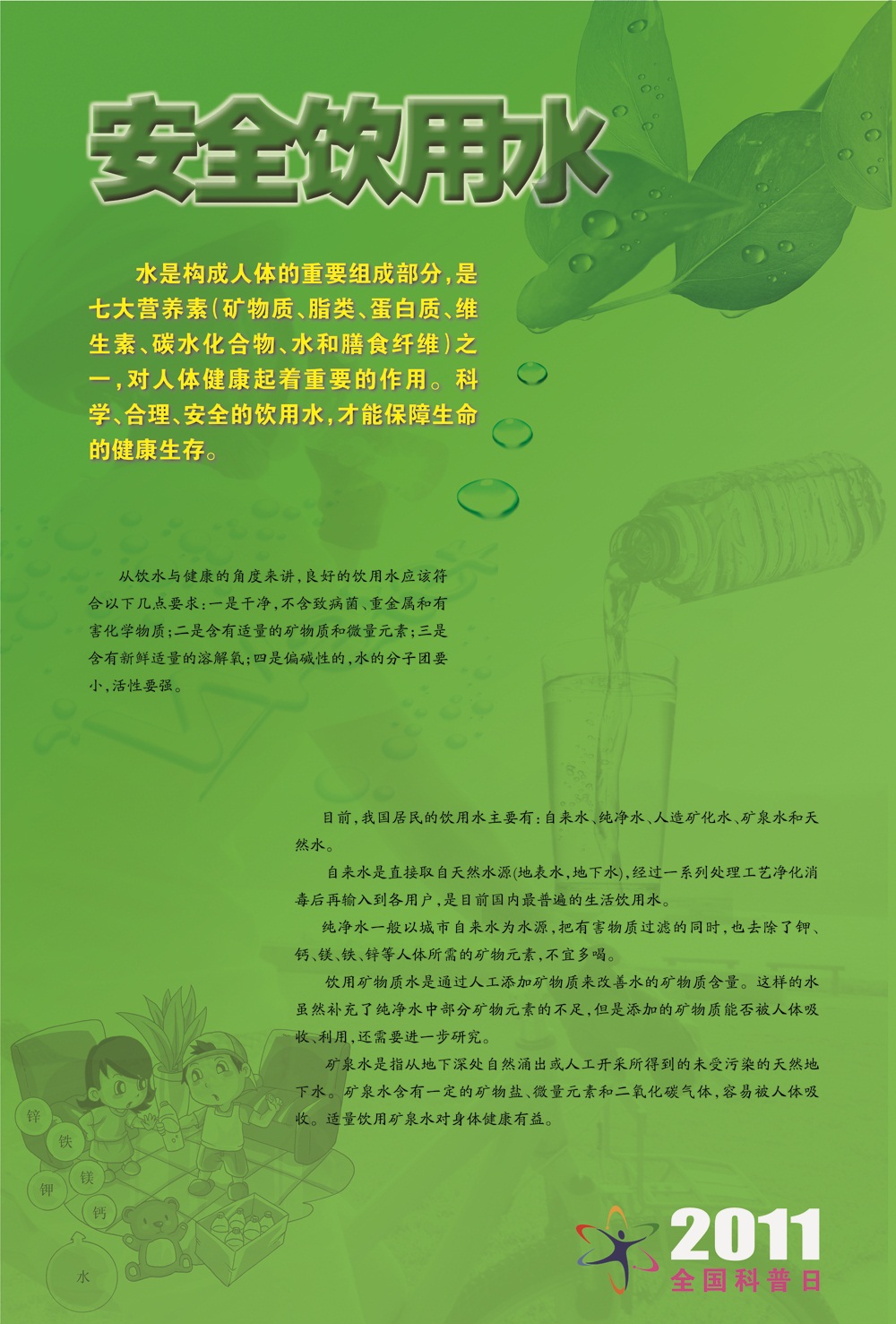 安全饮用水主题挂图是2011年全国科普日活动的系列主题挂图之一。共分七张,主要内容包括: