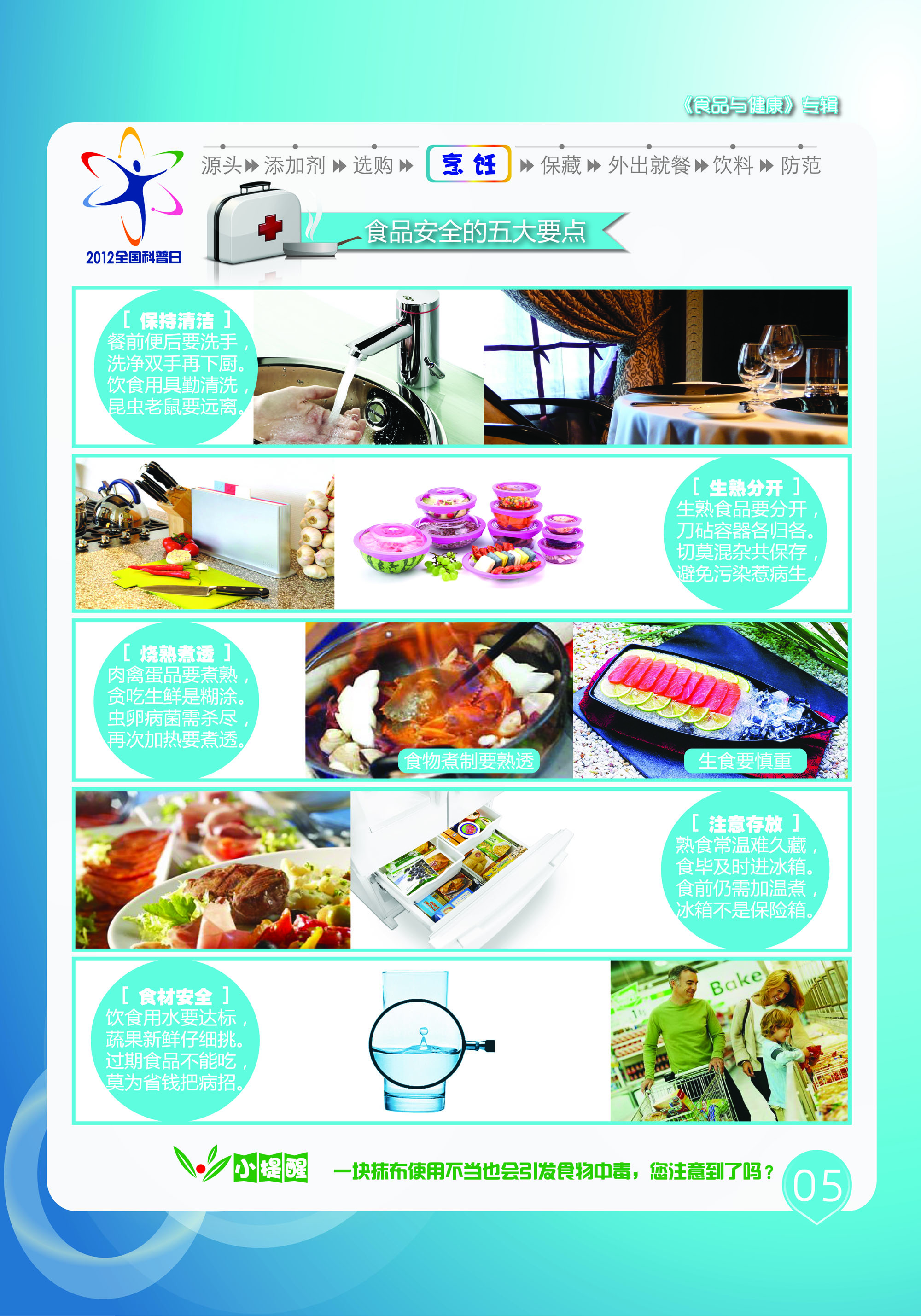 食品与健康主题挂图是2012年全国科普日活动的系列主题挂图之一。共有10张,本资源为第五张,主要内容为食品安全的五大要点。