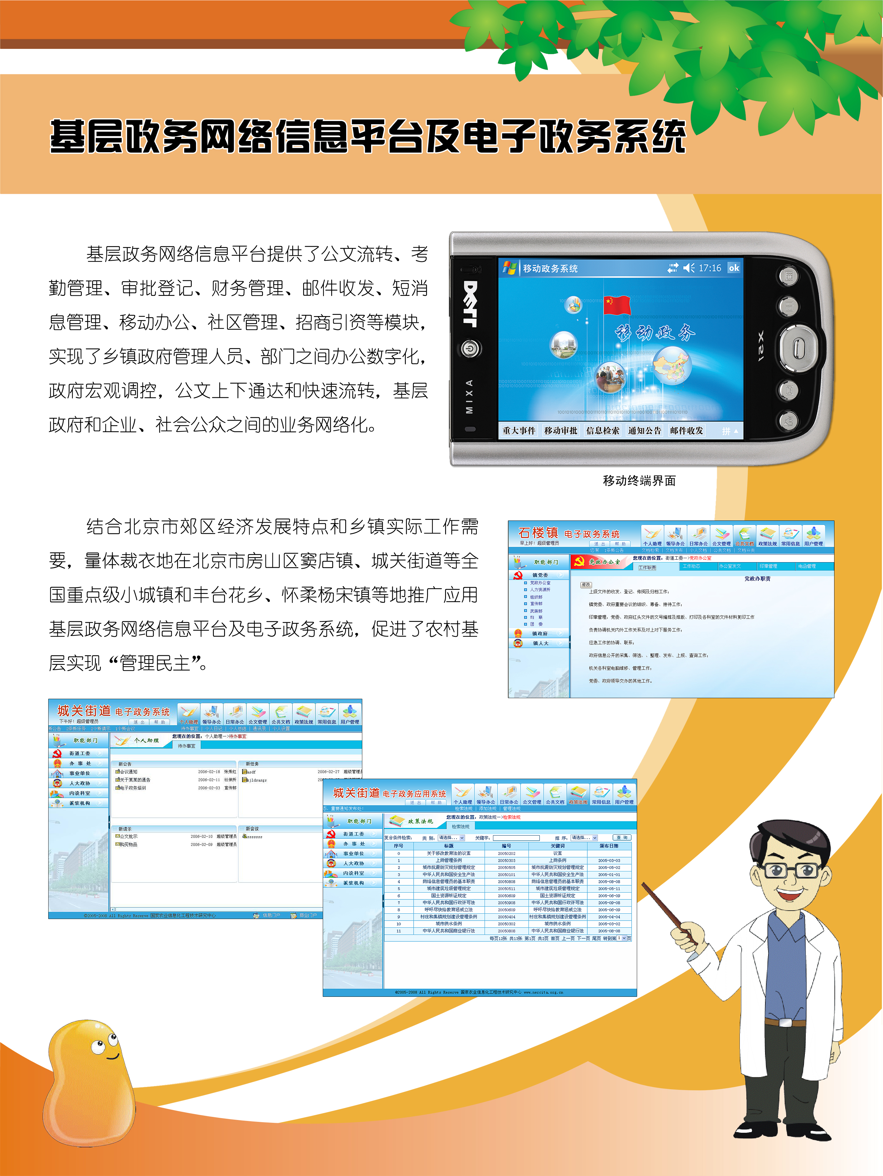 基层政务网络信息平台提供了公文流转、考勤管理等模块,实现了基层政府和企业、社会公众之间的业务网络化。基层政务网络信息平台及电子政务系统结合北京市郊区经济发展特点和乡镇实际工作需要,促进了农村基层实现“管理民主”。