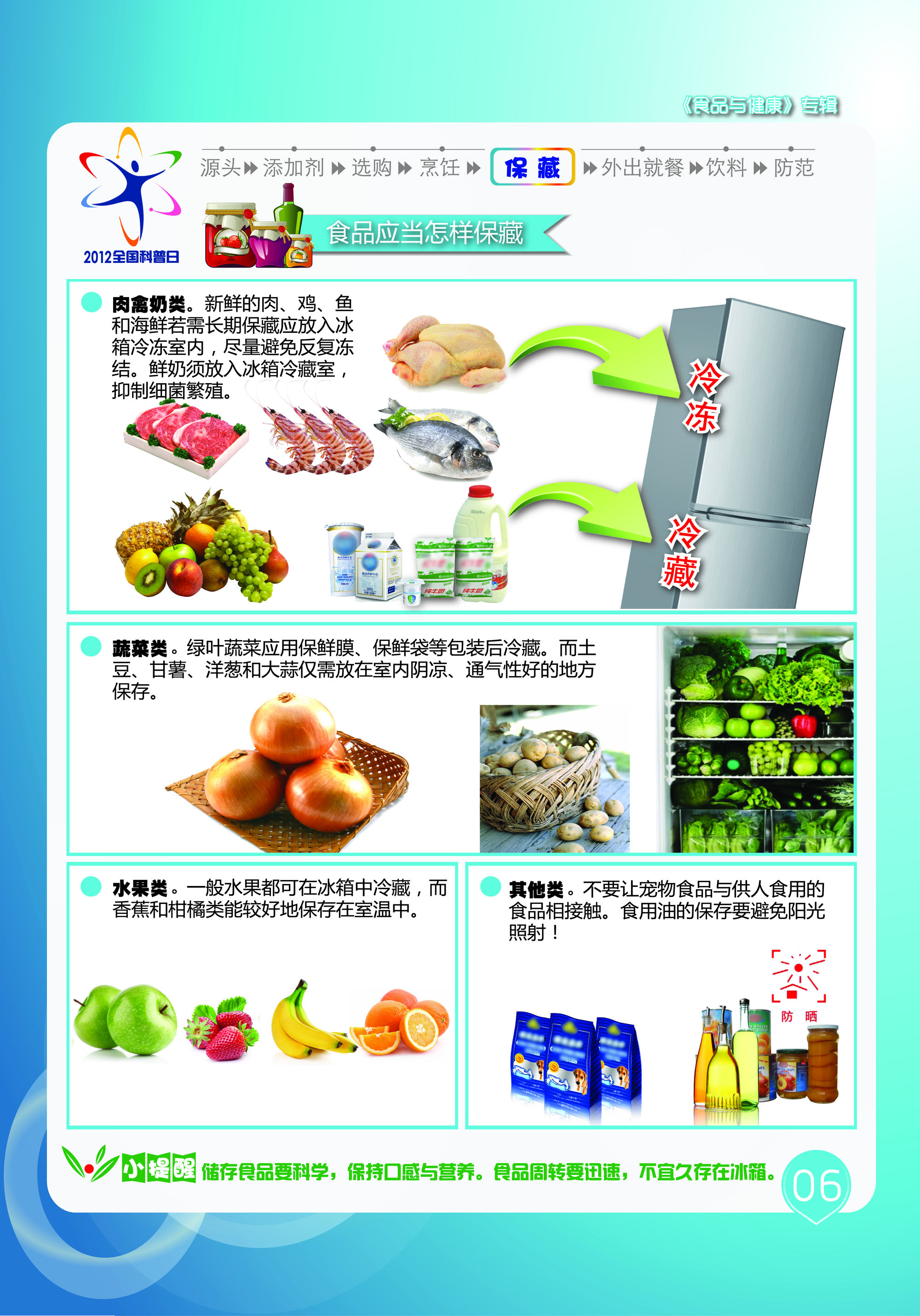 食品与健康主题挂图是2012年全国科普日活动的系列主题挂图之一。共有10张,本资源为第六张,主要内容为食品应当怎样保藏。