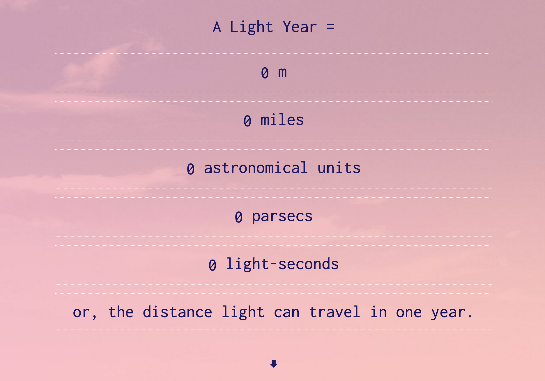 一光年约等于9.46兆公里,它是一个长度单位!今天的这个网站就是让我们从数字和实例中了解光年,没有冗长的报告式介绍,简单明了,使你秒懂一光年