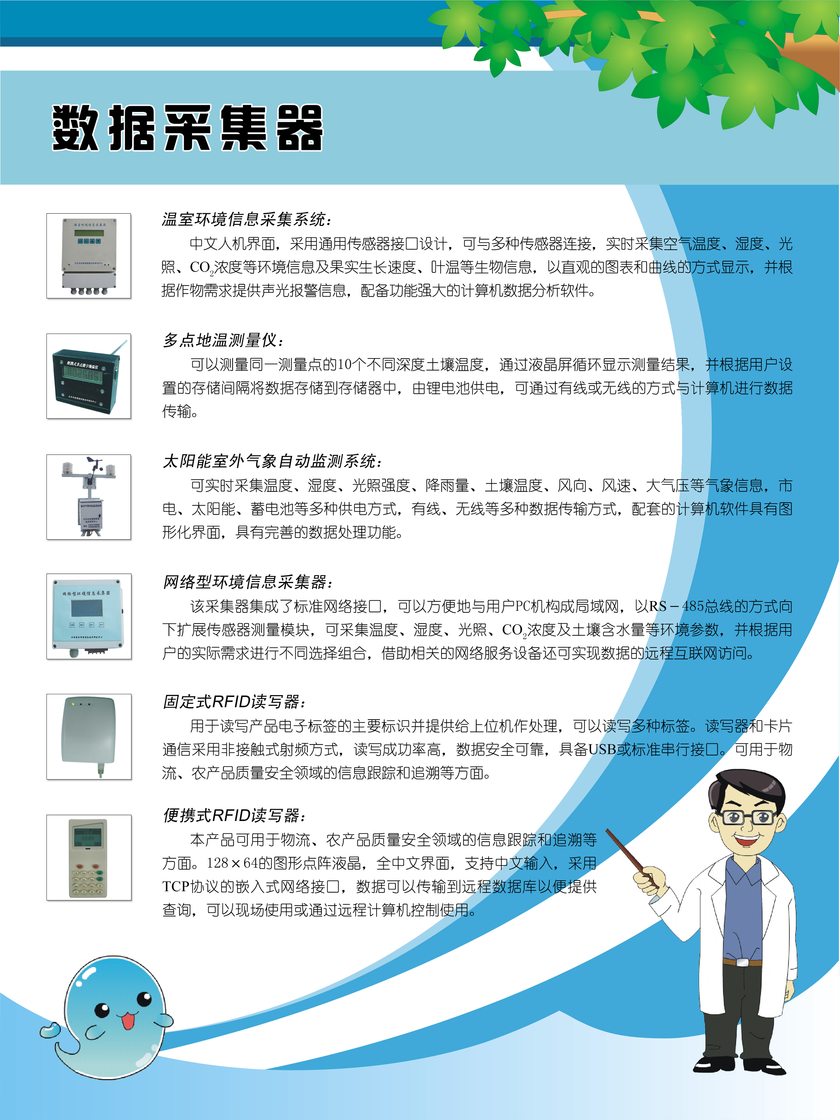 本资源《数据采集器》包含以下内容:温室环境信息采集系统、多点地温测量仪、太阳能室外气象自动监测系统、网络型环境信息采集系统、便携式RFID读写器、固定式RFID读写器组成。