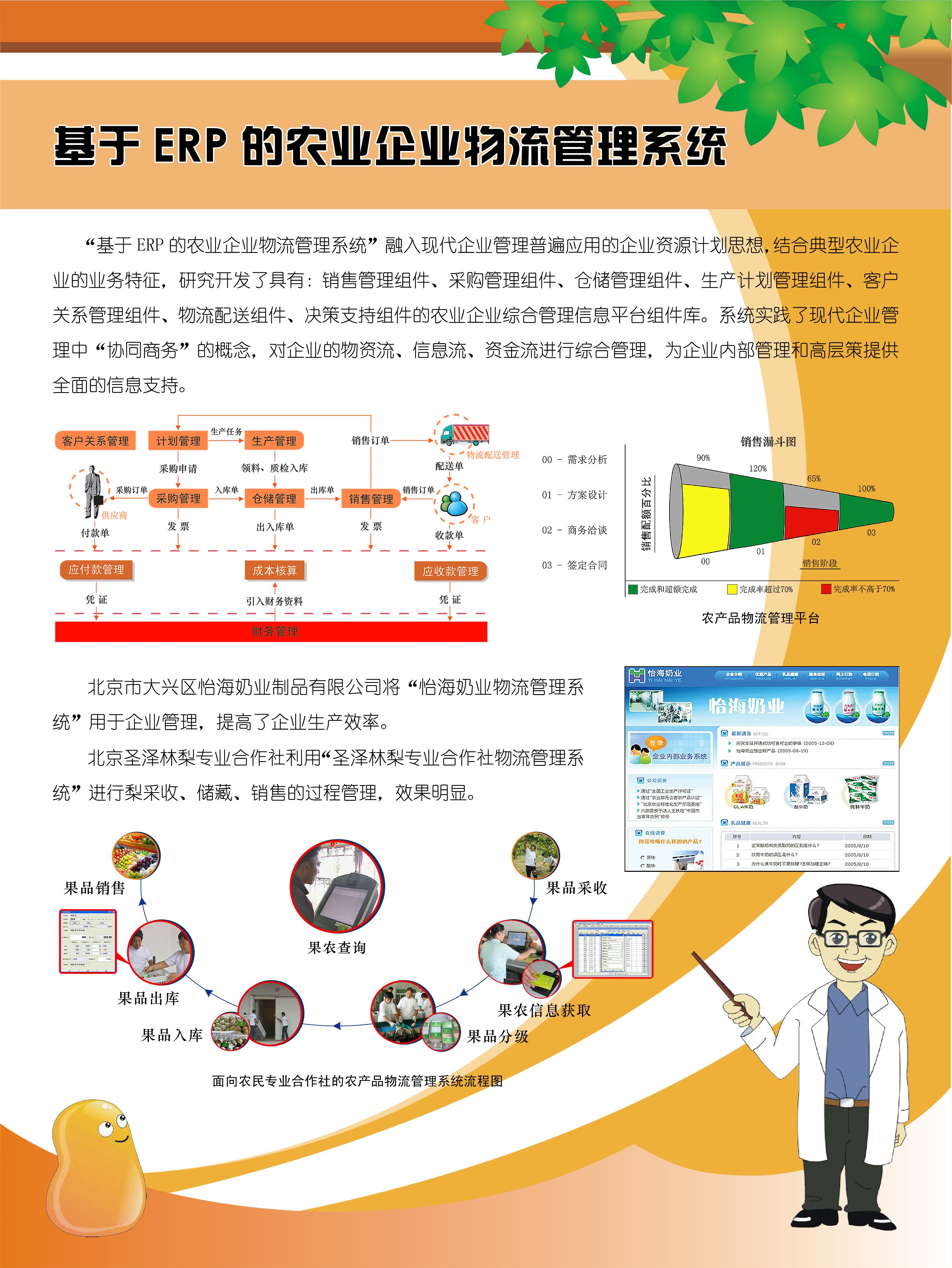 “基于ERP的农业企业物流管理系统”融入现代企业管理普遍应用的企业资源计划思想,结业的业务特征,研发了具有:销售管理组件等的农业企业综合管理信息平台组件库,为企业内部管理和高层策提供全面的信息支持。