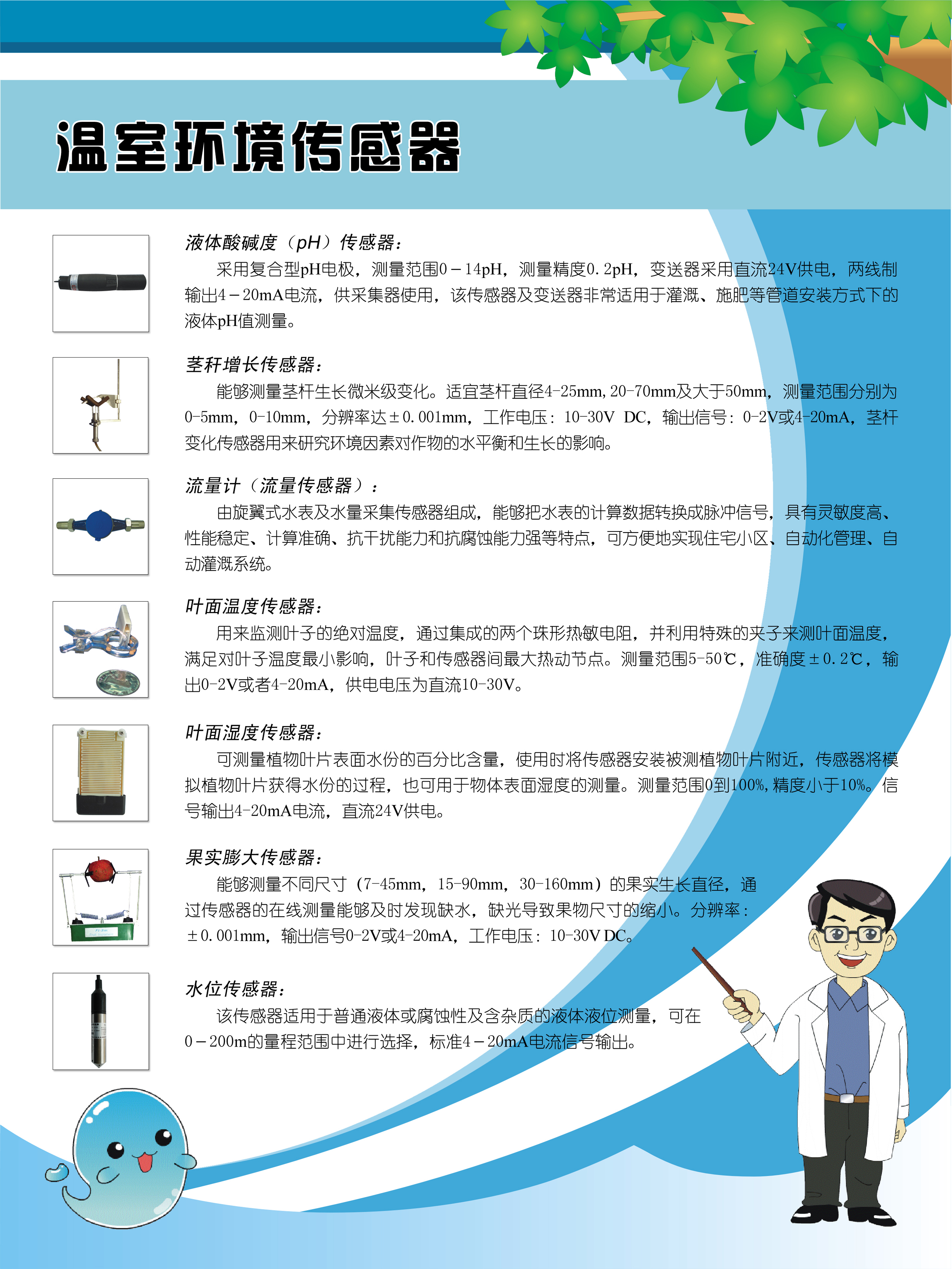 本资源《温室环境传感器》主要内容是介绍了以下7种传感器:液体酸碱度传感器、径秆增长传感器、流量计传感器、页面温度传感器、页面湿度传感器、果实膨胀传感器、水位传感器。