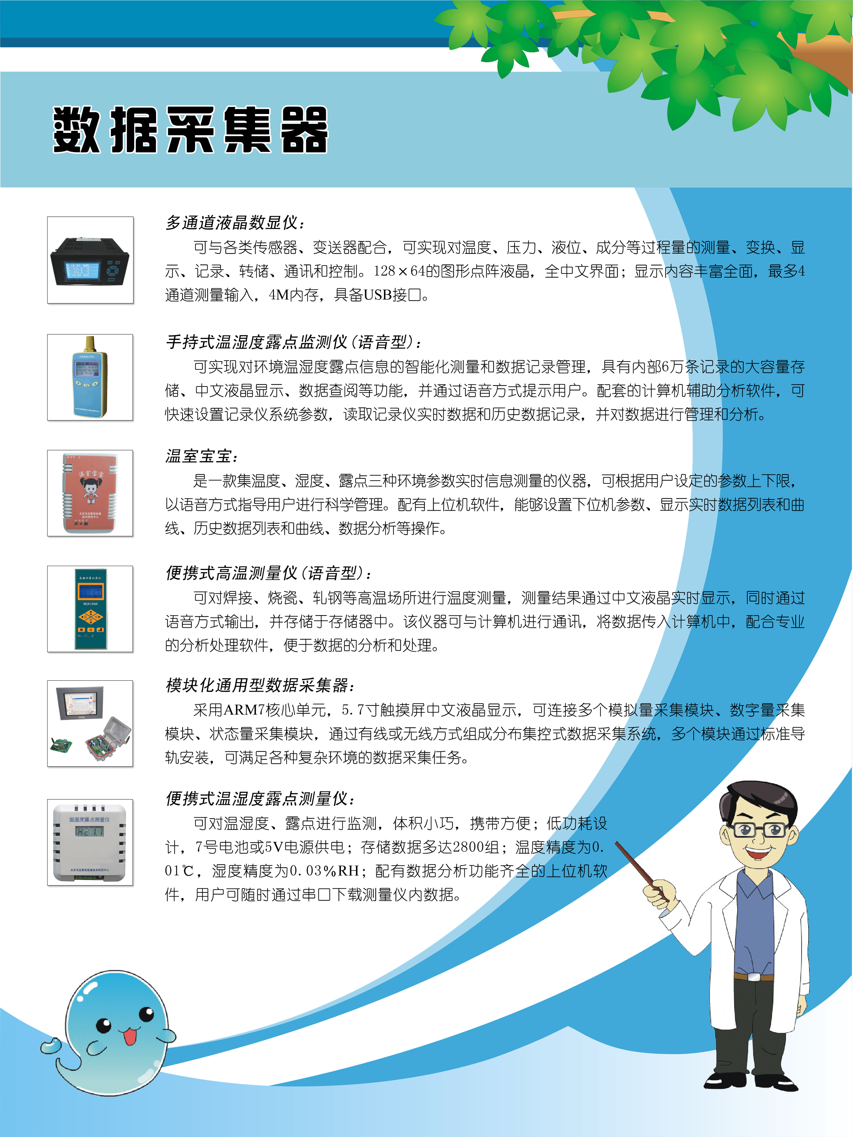 本资源《数据采集器》包含以下内容:多通道液晶数显仪、手持式温湿度露点监测仪(语音型)、温室宝宝、便携式高温测量仪(语音型)、模块化通用型数据采集仪、便携式温湿度露点测量仪组成。