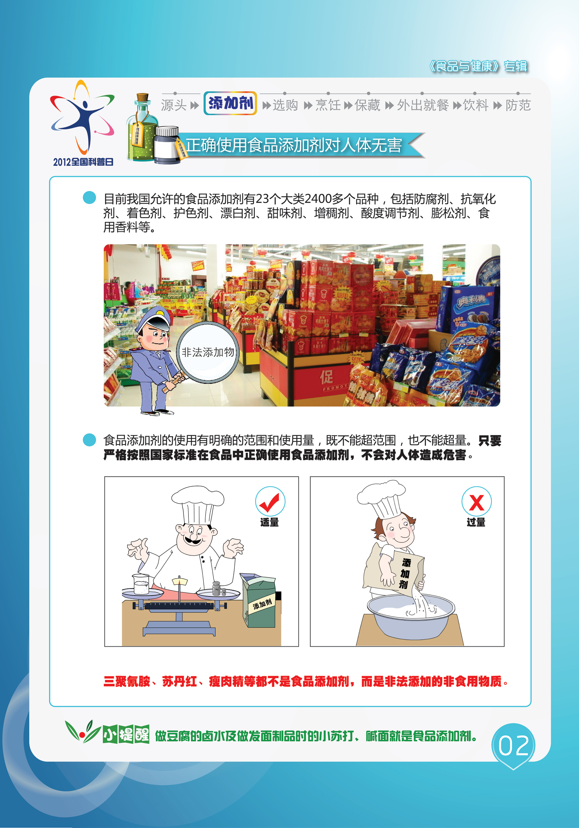 食品与健康主题挂图是2012年全国科普日活动的系列主题挂图之一。共有10张,本资源为第二张,主要内容为正确使用添加剂对人体无害。