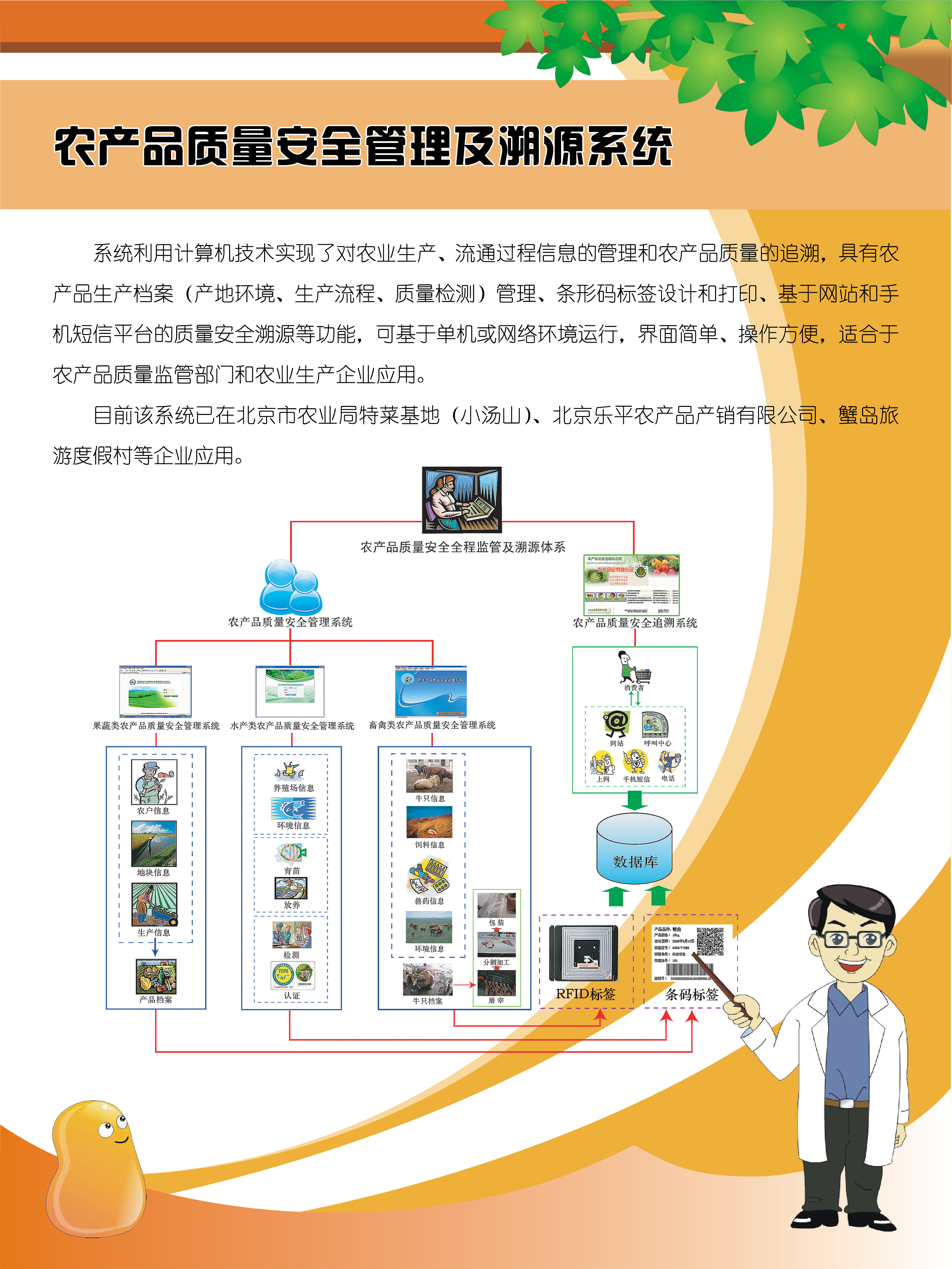 农产品质量安全管理及溯源系统是系统利用计算机技术实现了对农业生产、流通过程信息的管理和农产品质量的追溯,具有农产品生产档案管理、条形码标签设计和打印、基于网站和手机短信平台的质量安全溯源等功能。